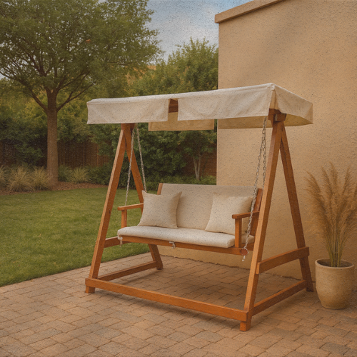 Crafted from natural wood and soft beige tones, this swing adds a cozy, elegant touch to your garden perfect for unwinding in style