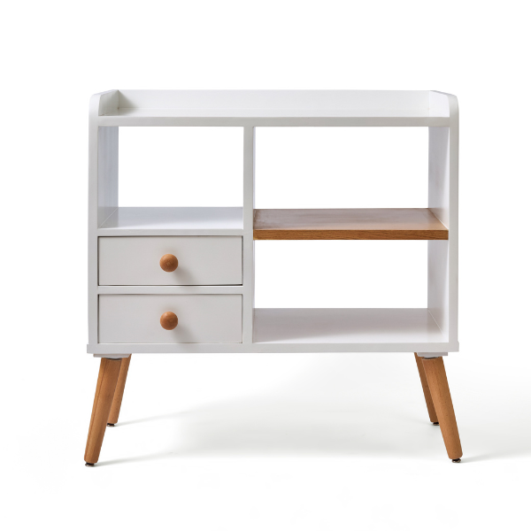 A stylish and functional coffee corner unit crafted from natural wood, featuring open shelves and two drawers for easy storage and organization. Its compact, modern design makes it perfect for displaying coffee machines, mugs, and accessories — an elegant addition to any kitchen or living space.